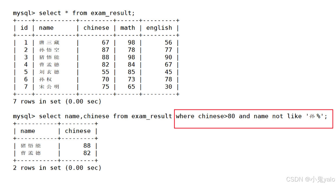mysql> select name,chinese from exam_result where chinese>80 and name not like '孙%';