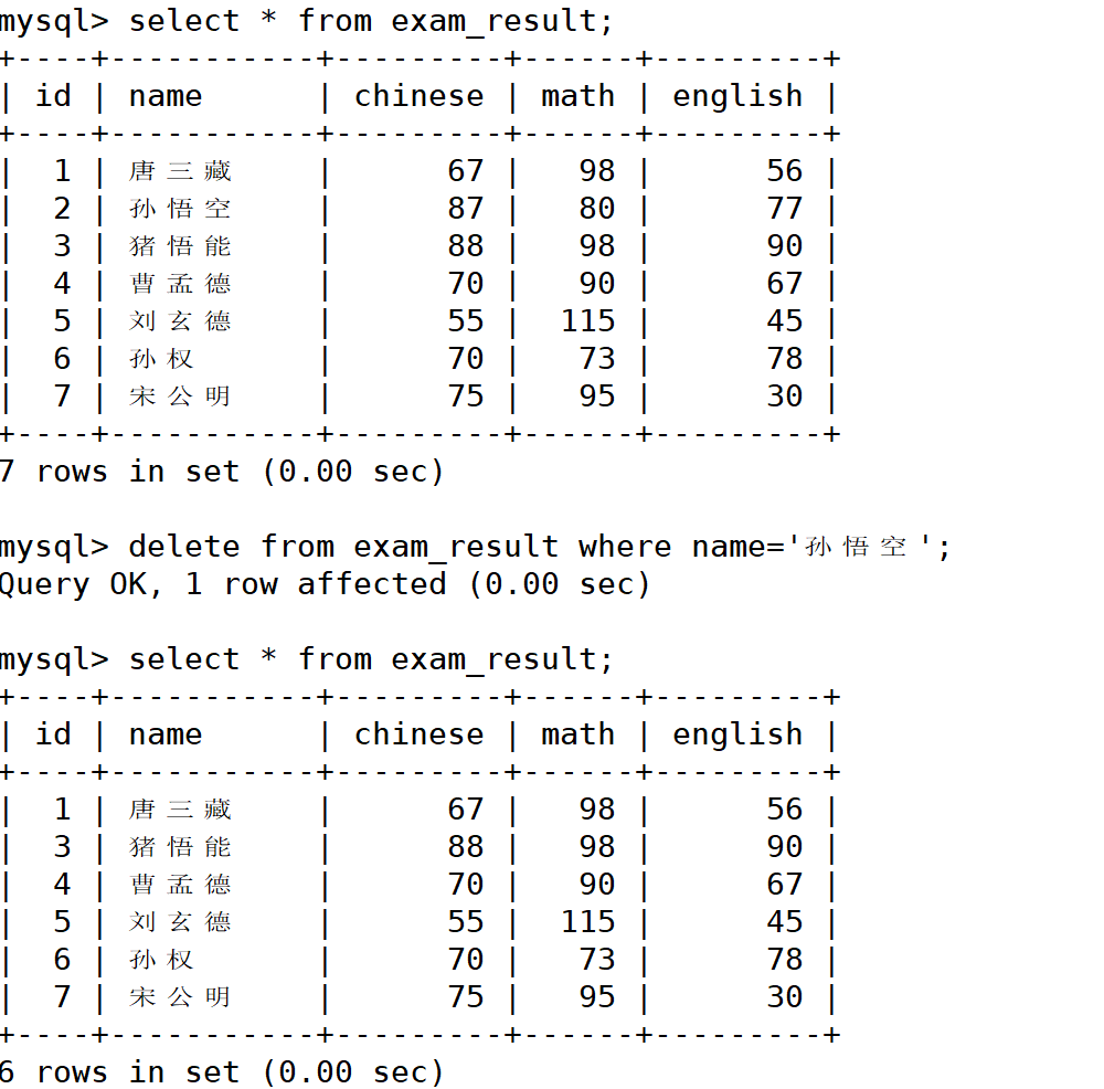 mysql> delete from exam_result where name='孙悟空';