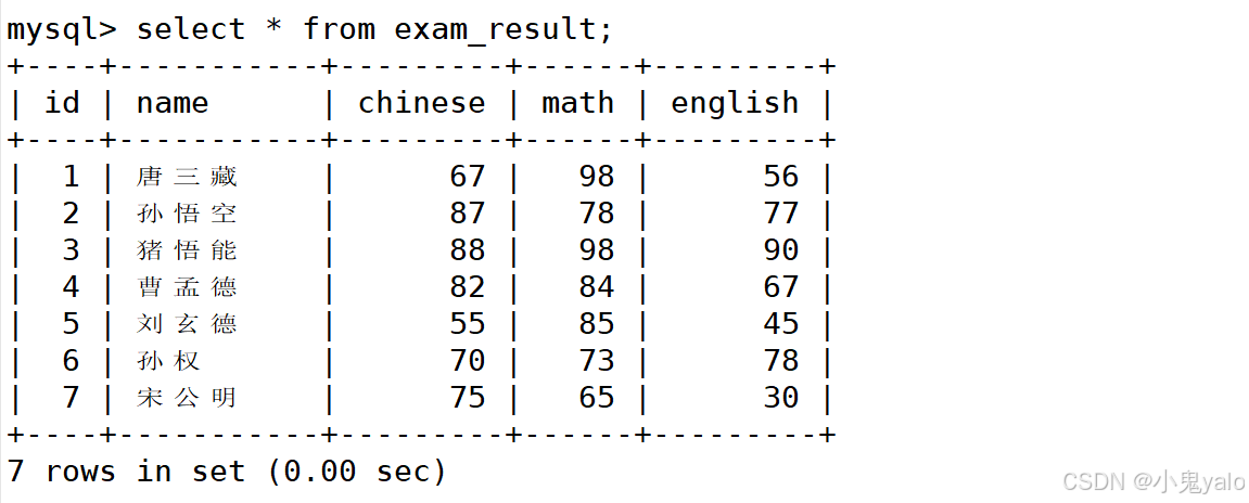 mysql> insert into exam_result (name,chinese,math,english) values ('孙悟空',87,78,77); mysql> insert into exam_result (name,chinese,math,english) values ('猪悟能',88,98,90); mysql> insert into exam_result (name,chinese,math,english) values ('曹孟德',82,84,67); mysql> insert into exam_result (name,chinese,math,english) values ('刘玄德',55,85,45); mysql> insert into exam_result (name,chinese,math,english) values ('孙权',70,73,78); mysql> insert into exam_result (name,chinese,math,english) values ('宋公明',75,65,30);