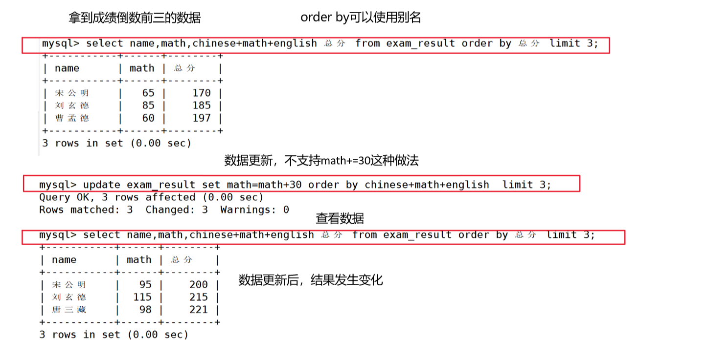 mysql> select name,math,chinese+math+english 总分 from exam_result order by 总分 limit 3;