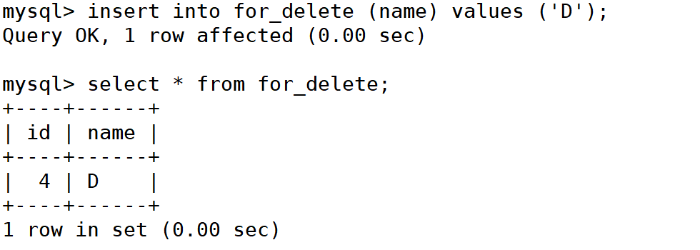 mysql> insert into for_delete (name) values ('D');