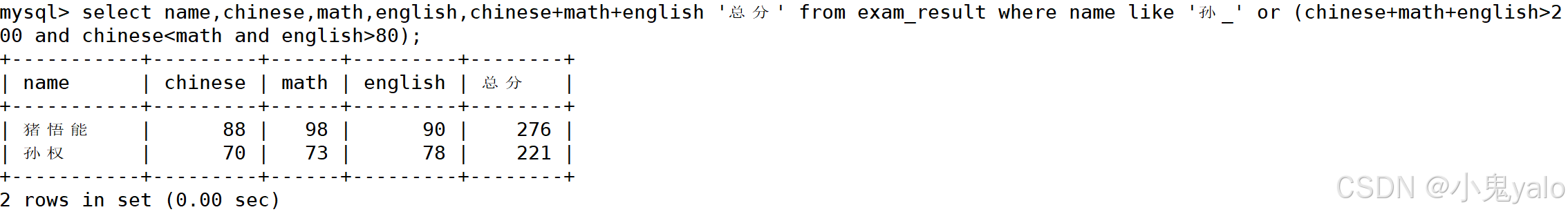 mysql> select name,chinese,math,english,chinese+math+english '总分' from exam_result where name like '孙_' or (chinese+math+english>200 and chinese<math and english>80);