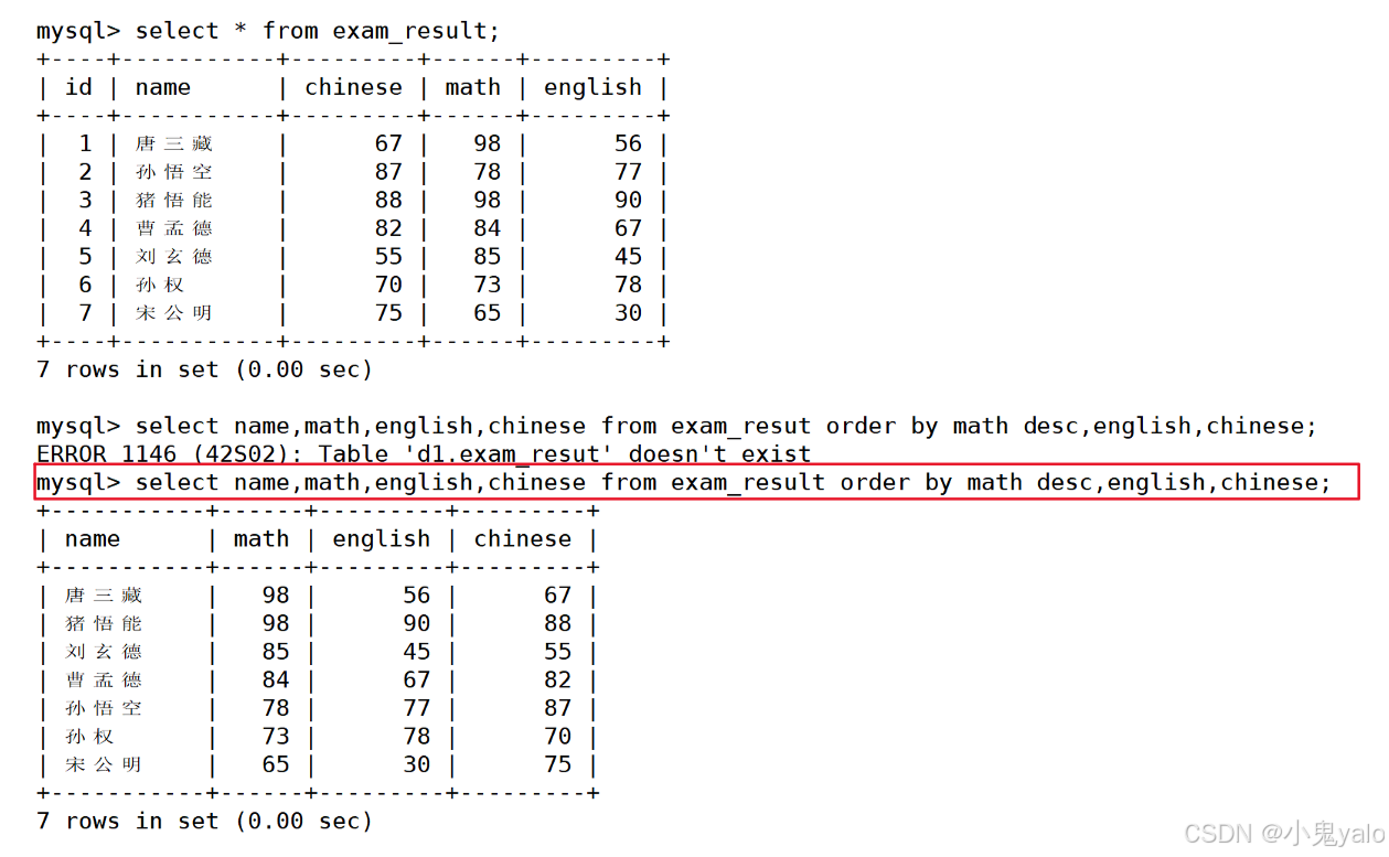 mysql> select name,math,english,chinese from exam_result order by math desc,english,chinese;