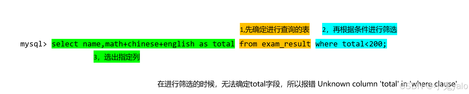 总结:先确定操作哪张表,再根据where子句的条件筛选出我们想要的数据,最后再显示出来。 所以在where子句中不能使用别名,但在select中仍然可以使用。