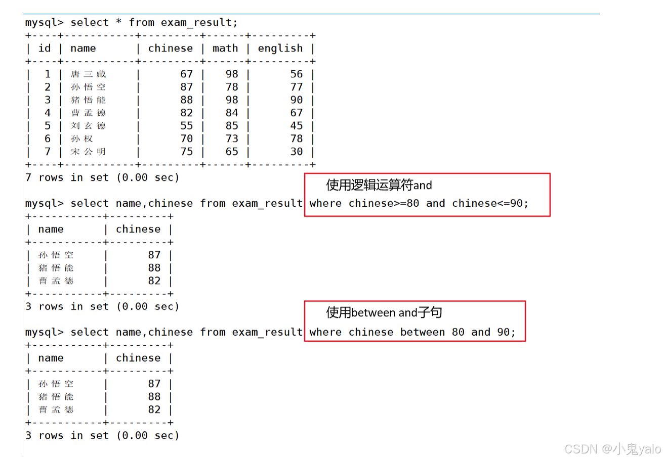 mysql> select name,chinese from exam_result where chinese>=80 and chinese<=90; mysql> select name,chinese from exam_result where chinese between 80 and 90;