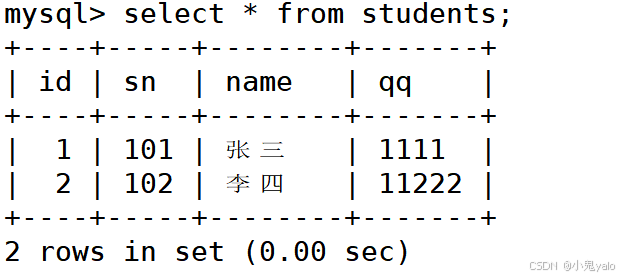 mysql> insert into students values (1,101,'张三',1111); mysql> insert into students values (2,102,'李四',11222);