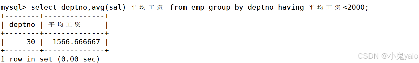 mysql> select deptno,avg(sal) 平均工资 from emp group by deptno having 平均工资<2000;