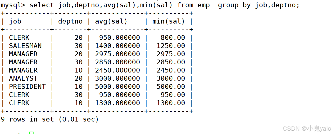 mysql> select job,deptno,avg(sal),min(sal) from emp group by job,deptno;