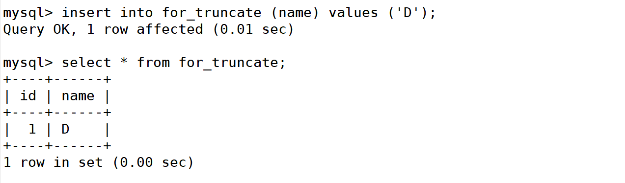 mysql> insert into for_truncate (name) values ('D');