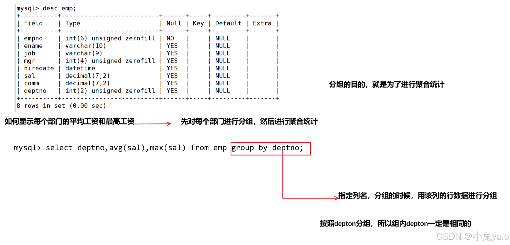 总结: 分组,可以理解为把一张表按照条件在逻辑上分成了很多子表,然后分别对各自的子表进行聚合统计。