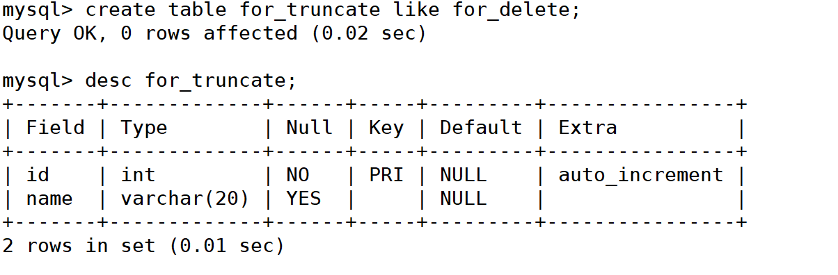 mysql> create table for_truncate like for_delete;