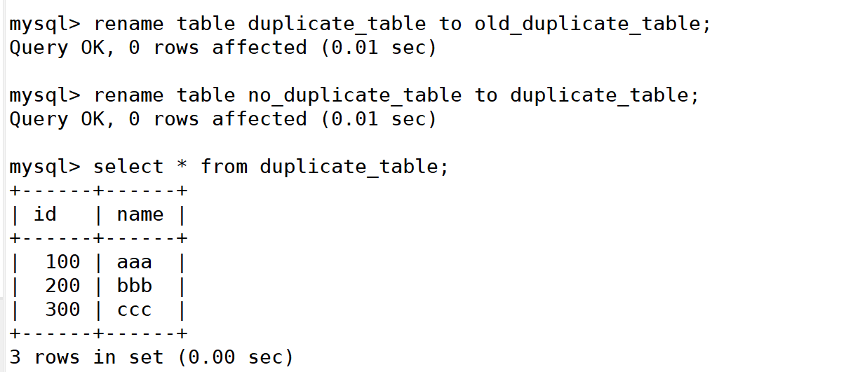 mysql> rename table duplicate_table to old_duplicate_table; mysql> rename table no_duplicate_table to duplicate_table;