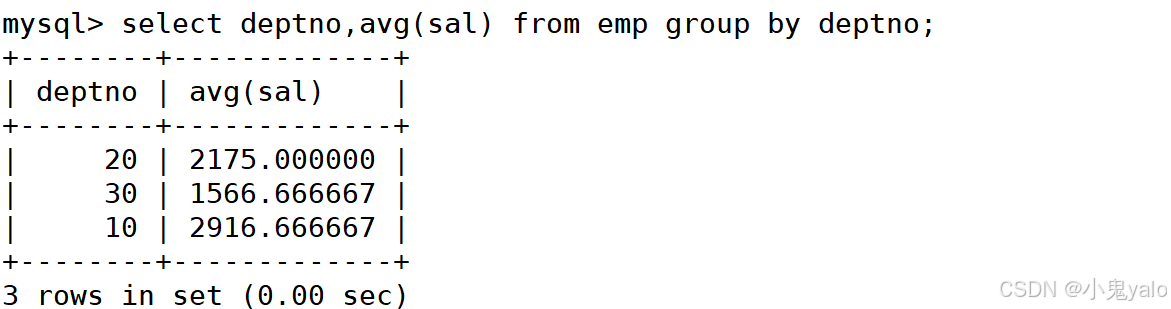 mysql> select deptno,avg(sal) from emp group by deptno;