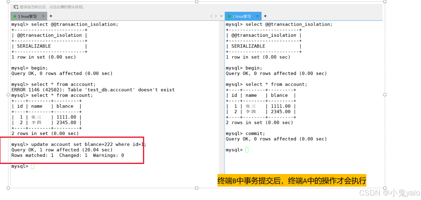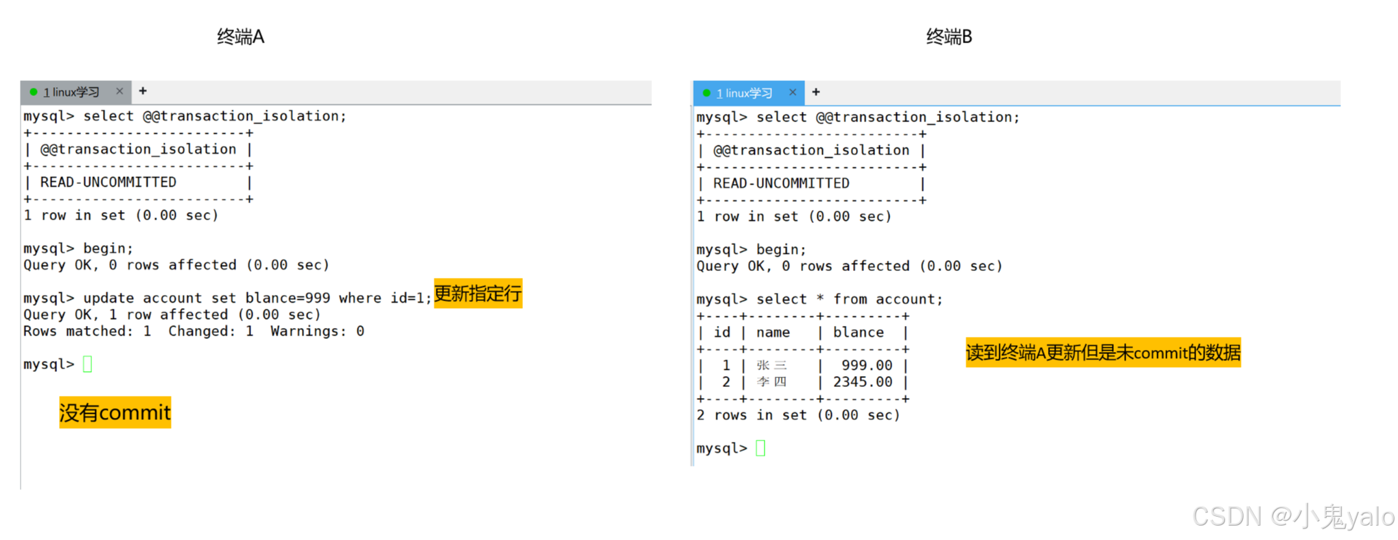 现象演示:(先将当前隔离级别设置为read uncommitted)