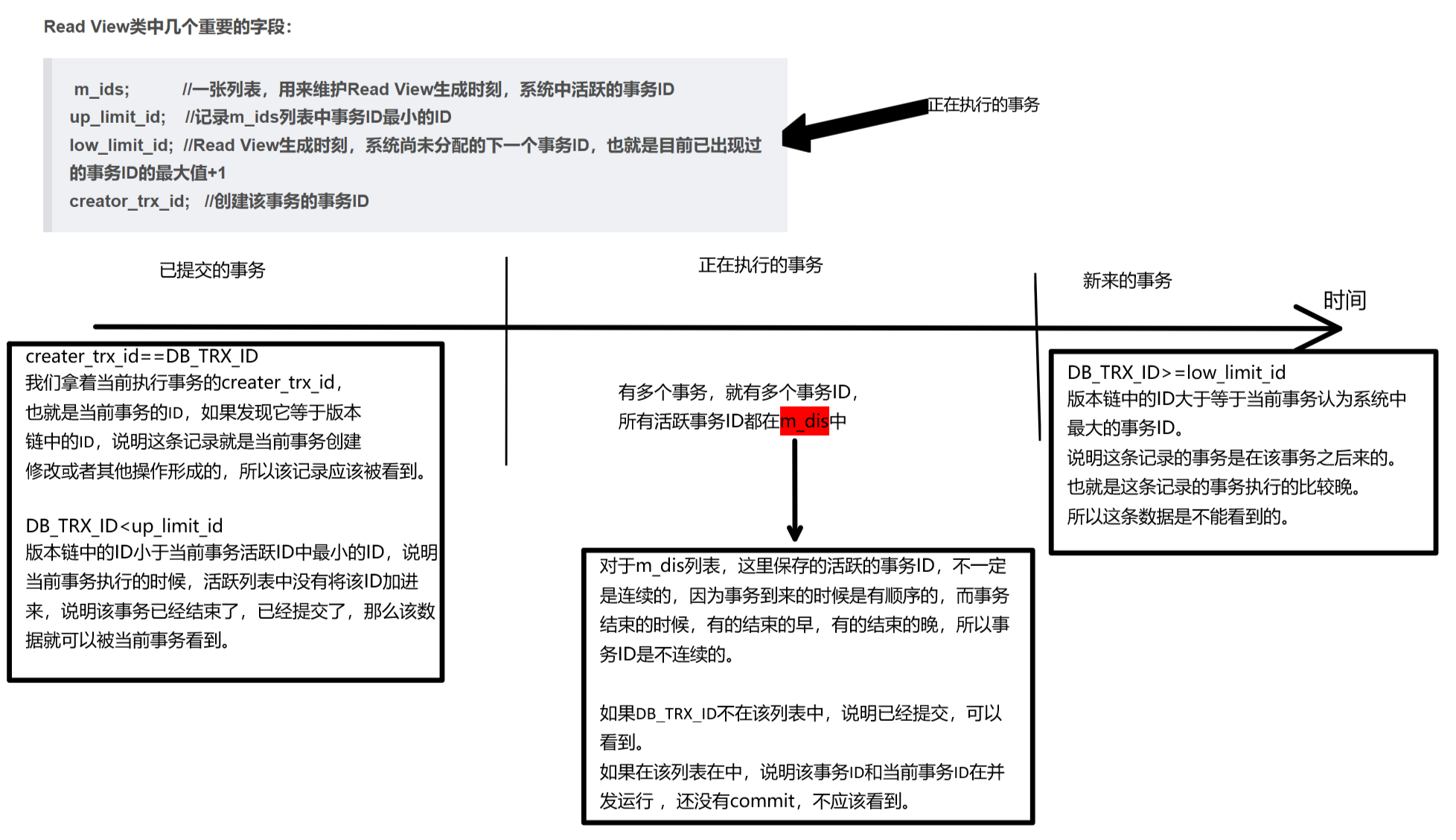 m_ids; //一张列表,用来维护Read View生成时刻,系统中活跃的事务ID up_limit_id; //记录m_ids列表中事务ID最小的ID low_limit_id; //Read View生成时刻,系统尚未分配的下一个事务ID,也就是目前已出现过的事务ID的最大值+1 creator_trx_id; //创建该事务的事务ID
