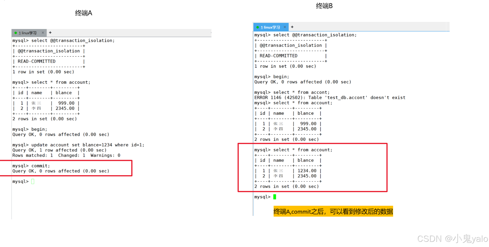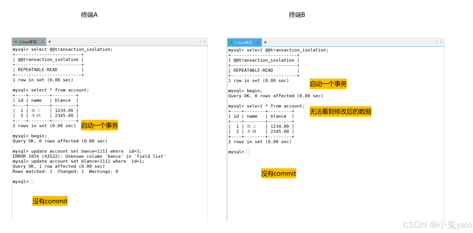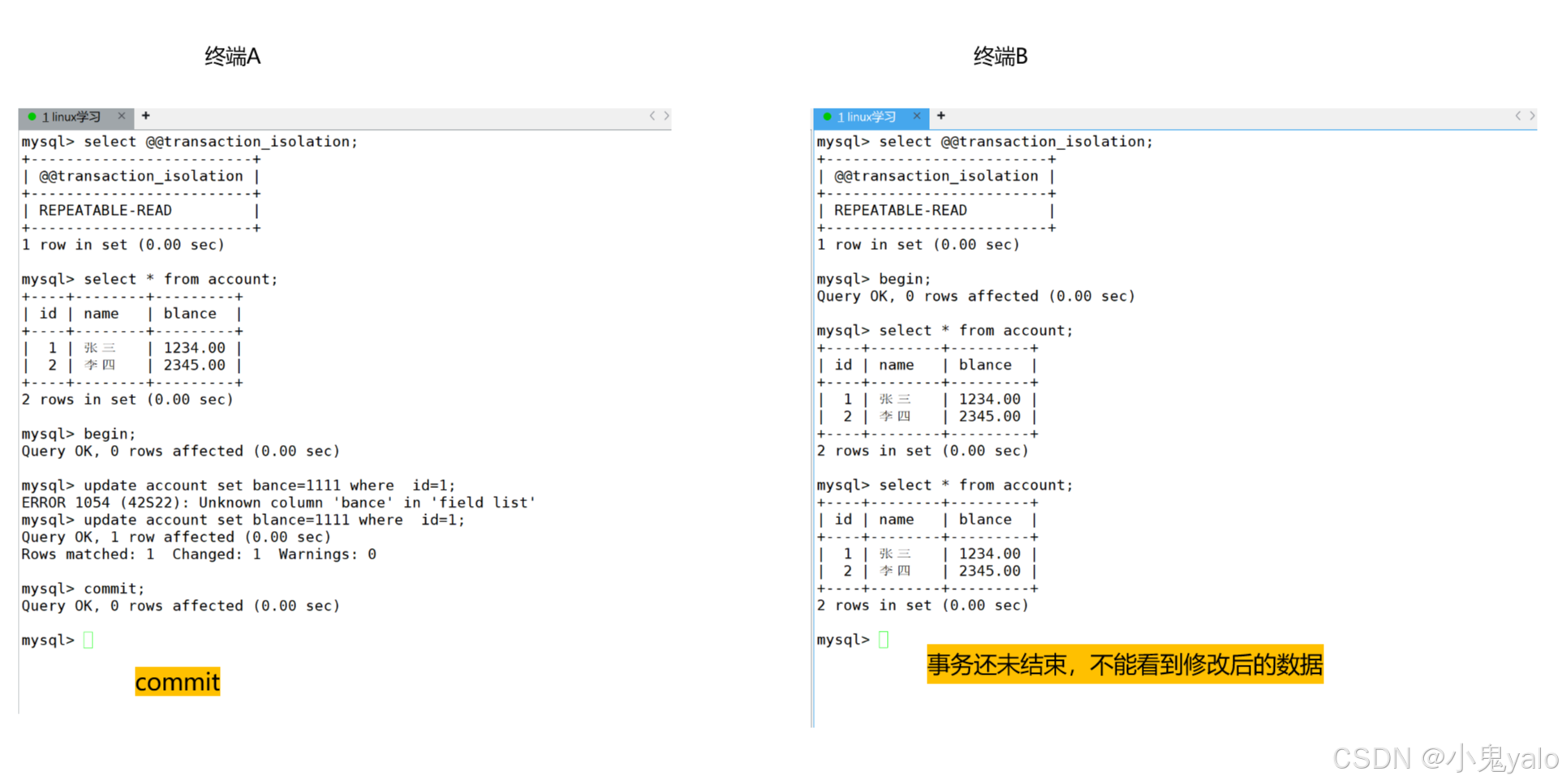 但是,终端B事务还未结束,那么就造成了,同一个事务内,同样的读取,在不同的时间段,读到了不同的数据,这种现象,叫做不可重复读。