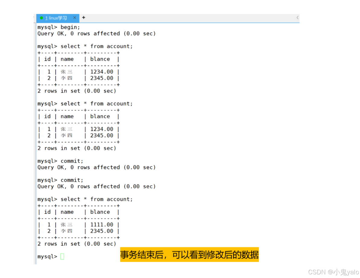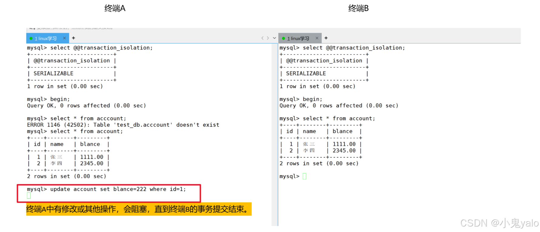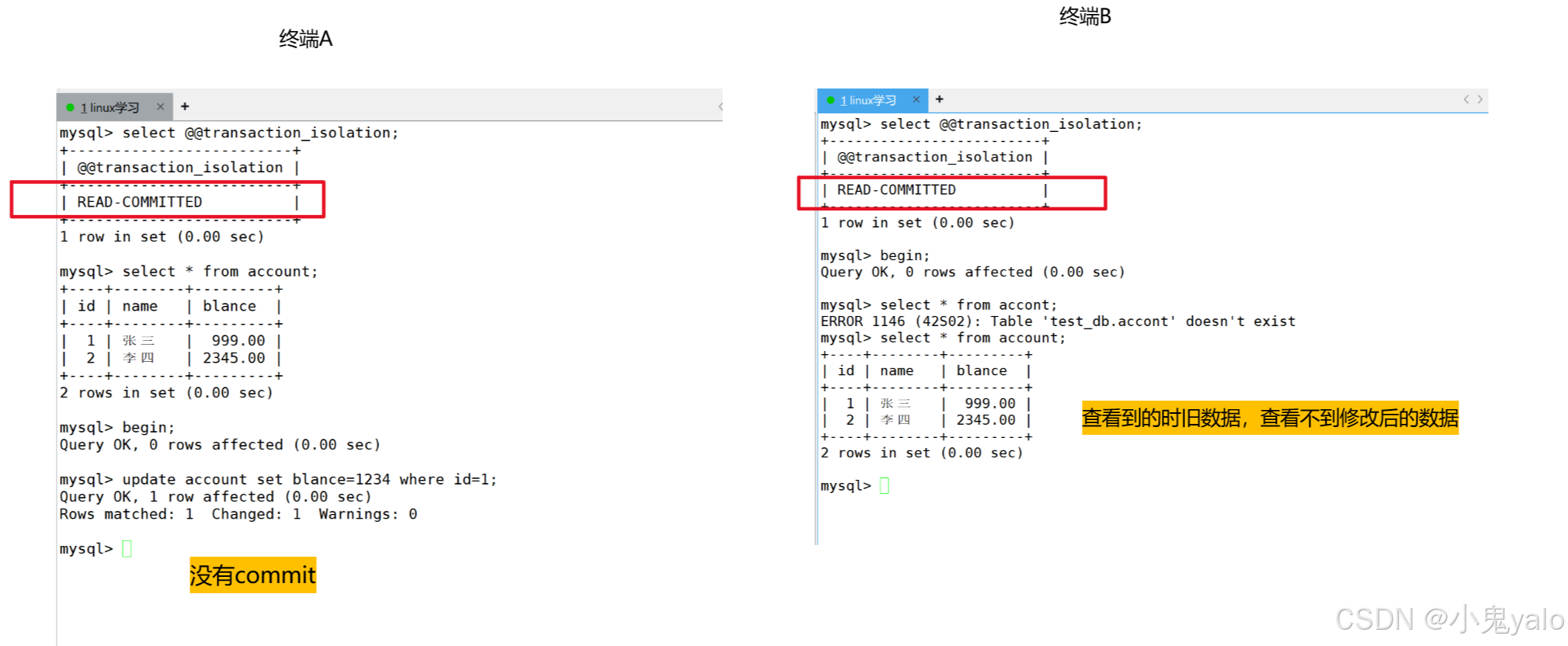 但是,终端B事务还未结束,那么就造成了,同一个事务内,同样的读取,在不同的时间段,读到了不同的数据,这种现象,叫做不可重复读。