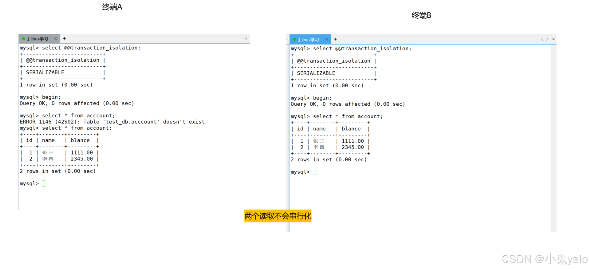 mysql> set session transaction isolation level serializable; -- 串行化