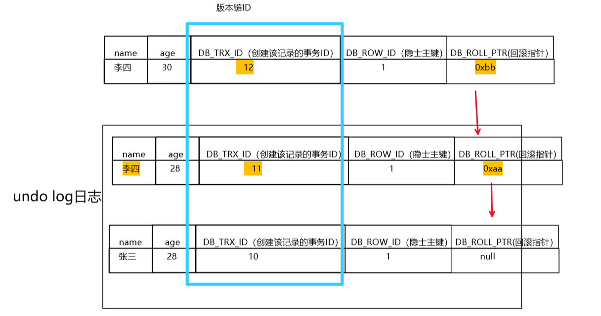 对于undo log中的数据版本链,我们在读取的时候,是能读取到每一个版本的事务ID的,即DB_TRX_ID。