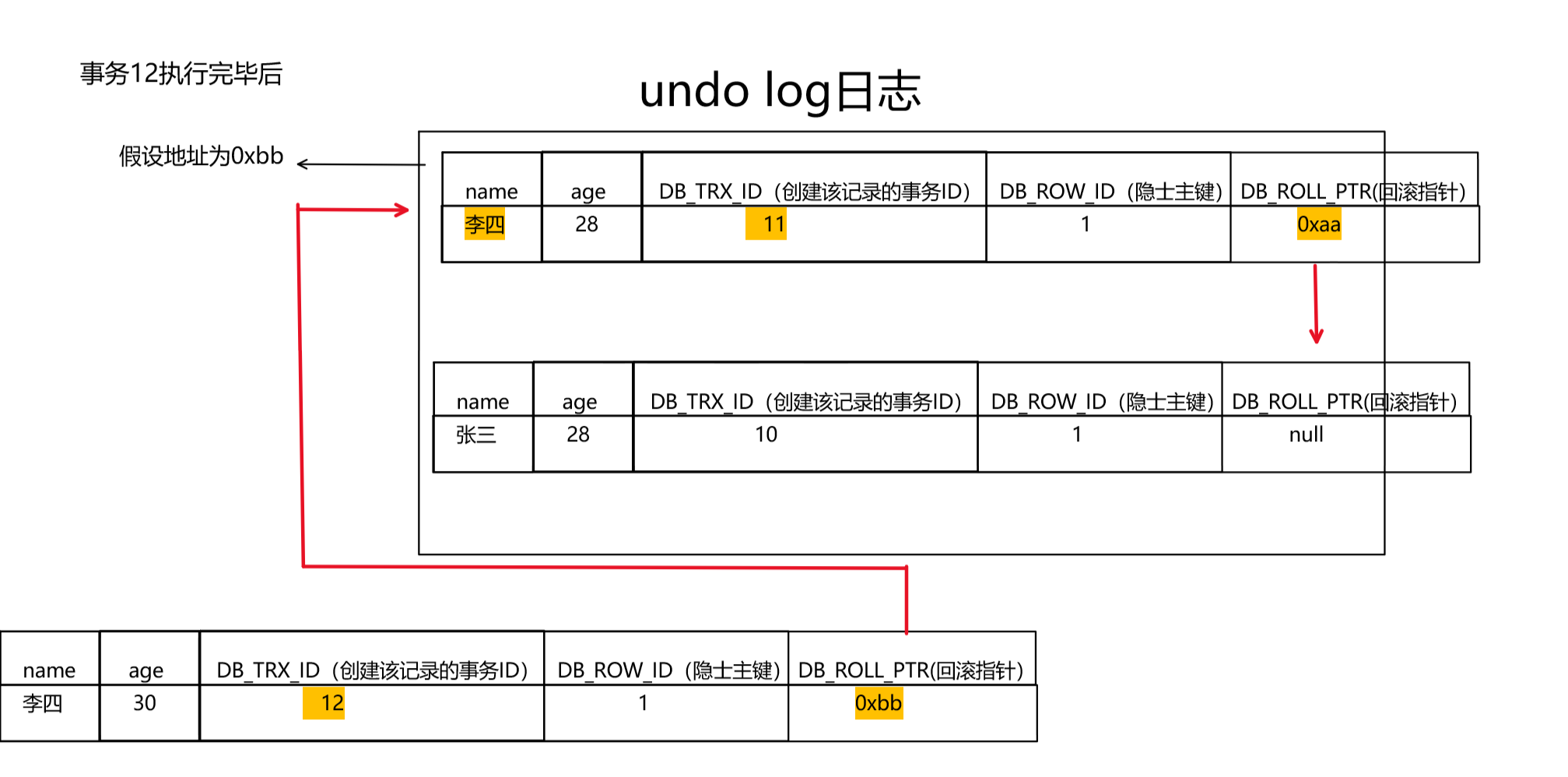 假设又有一个事务,事务ID为12,要将age改为30,同样按照上述过程。