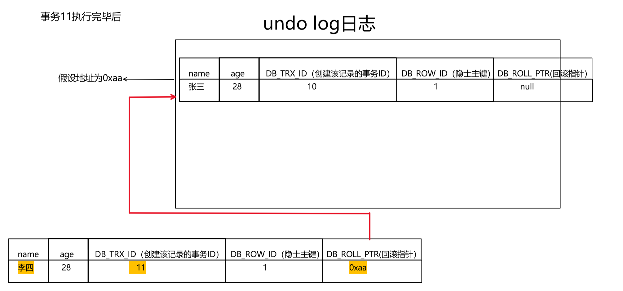 假设现在有一个事务,事务ID为11,对上面表的数据进行修改,将name(张三)改成name(李四)。大致过程如下: