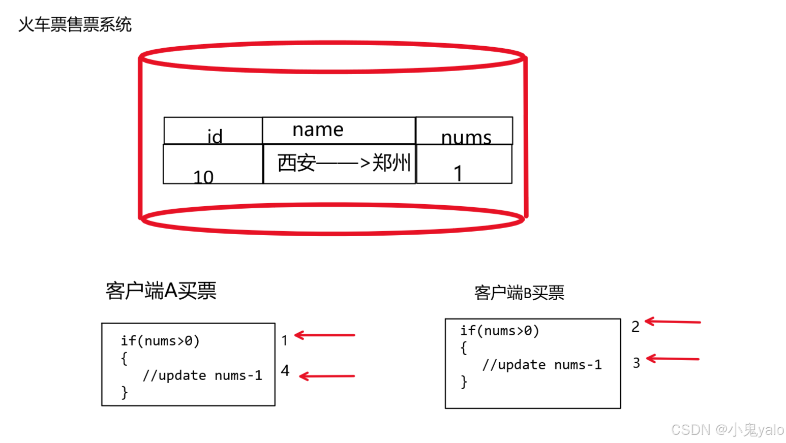 当客户端A检查到还有一张票时,将票卖掉,还没有 执行更新数据库的语句时,客户端B检查了票数,发现大于0,于是又买了一次票。然后 A将票数更新回数据库。这就出现了同一张票被买了2次的问题。