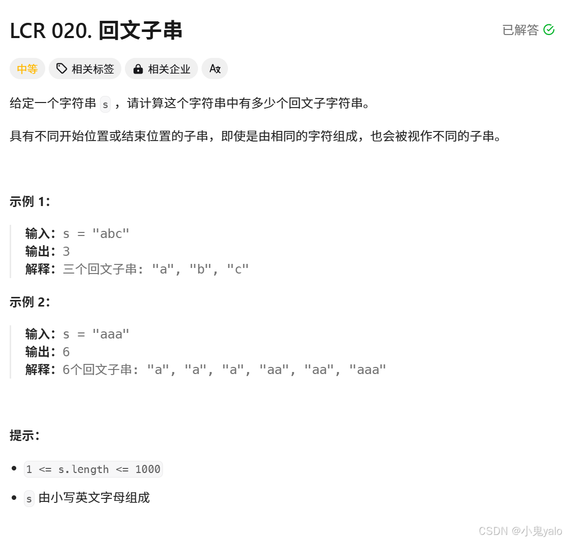 题目链接:LCR 020. 回文子串 - 力扣(LeetCode)