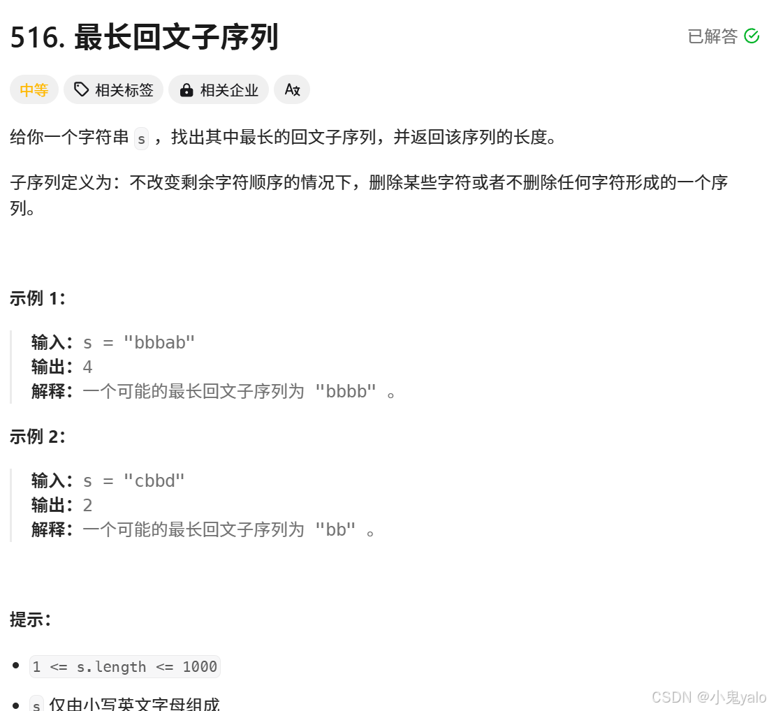 题目链接:516. 最长回文子序列 - 力扣(LeetCode)