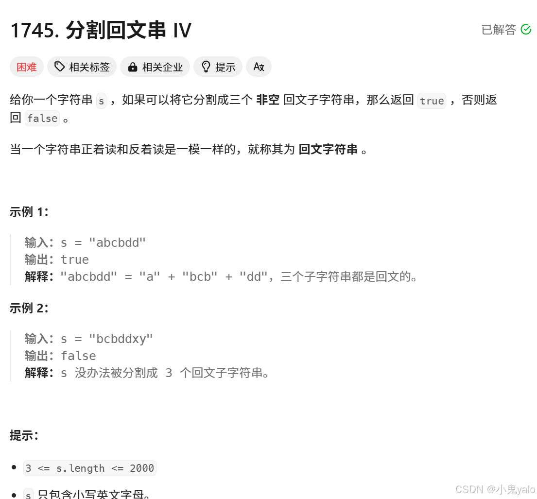 题目链接:1745. 分割回文串 IV - 力扣(LeetCode)