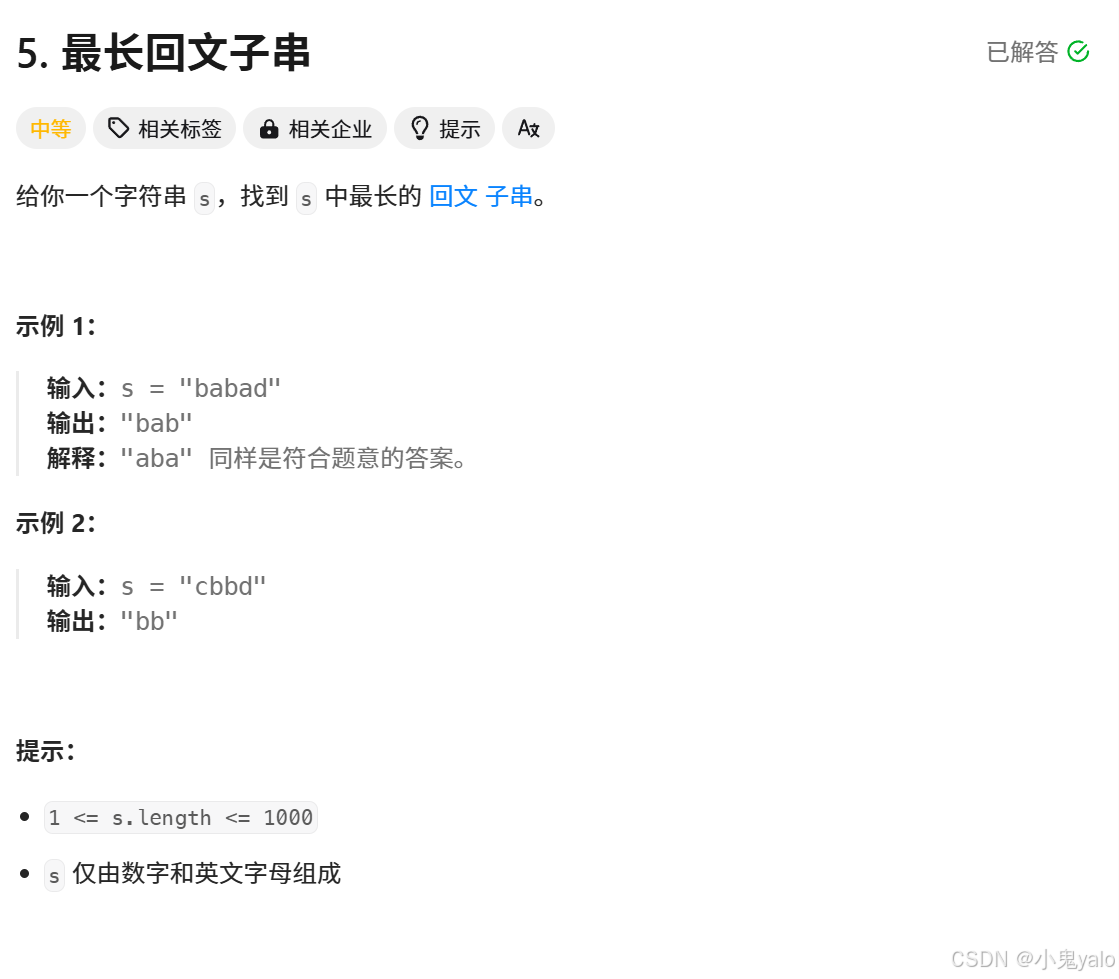2,回文子串的长度是偶数,让left=i-1,right=i(left=i,right=i+1也可以),同理,如果s[left]==s[right],left--,right++。最后回文子串的长度就是right-left-1。