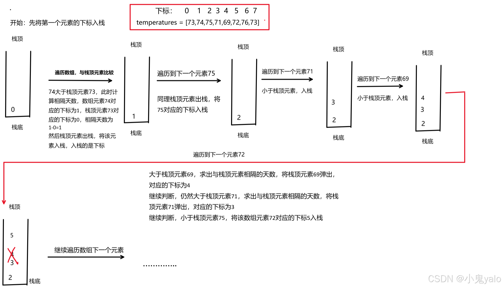 由于题目中求的是相隔的天数,所以我们不需要将数组元素入栈,只需入栈该元素的下标即可,这样就可以直接计算相隔的天数:数组元素对应的下标减去栈顶元素对应的下标,就是该栈顶元素与下一个更高温度相隔的天数。