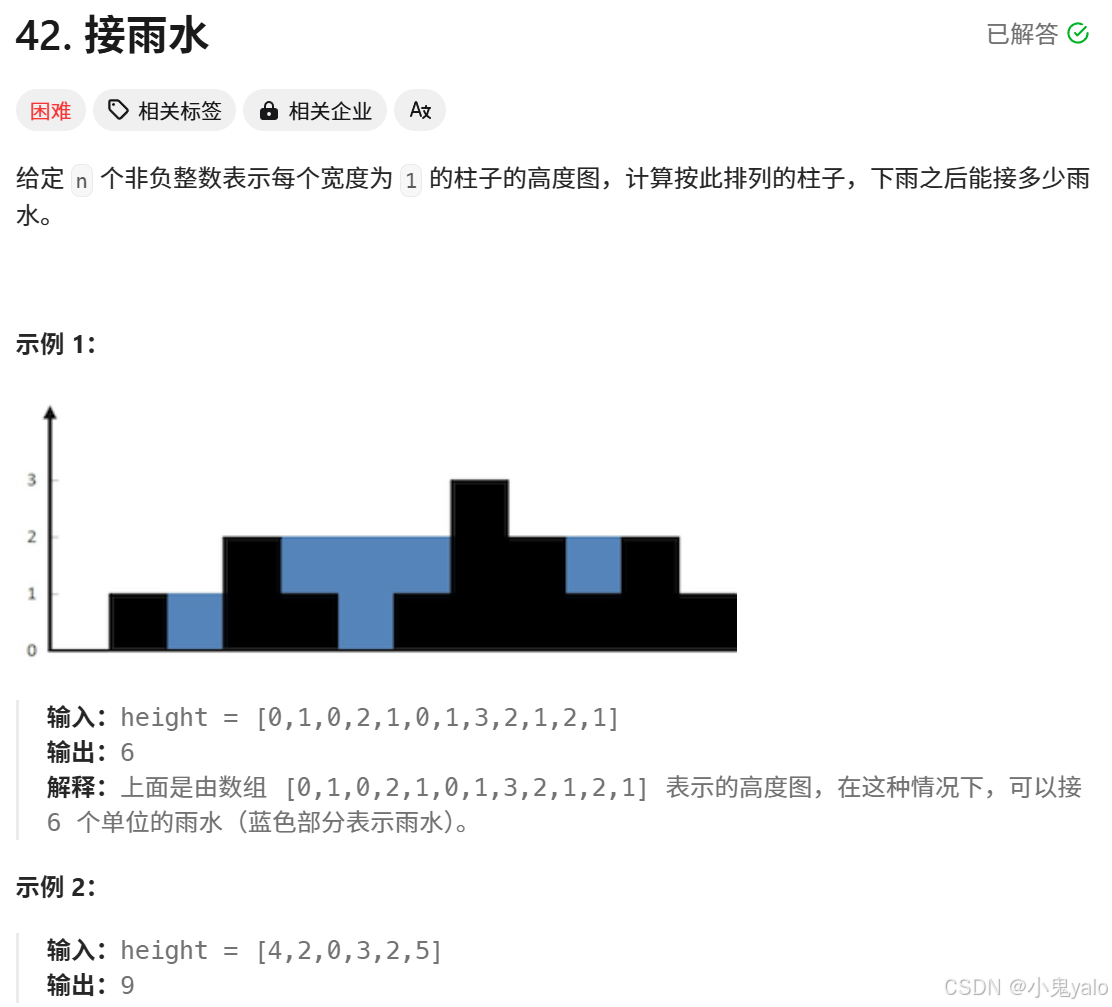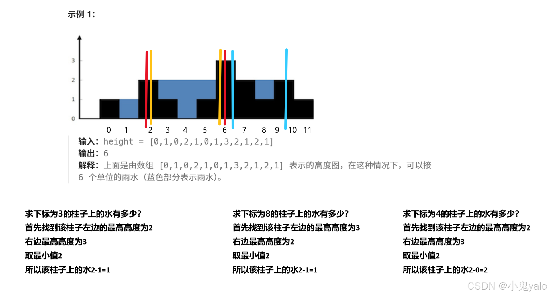 求这些柱子中一共有多少雨水。看每个柱子可以"接"多少雨水。