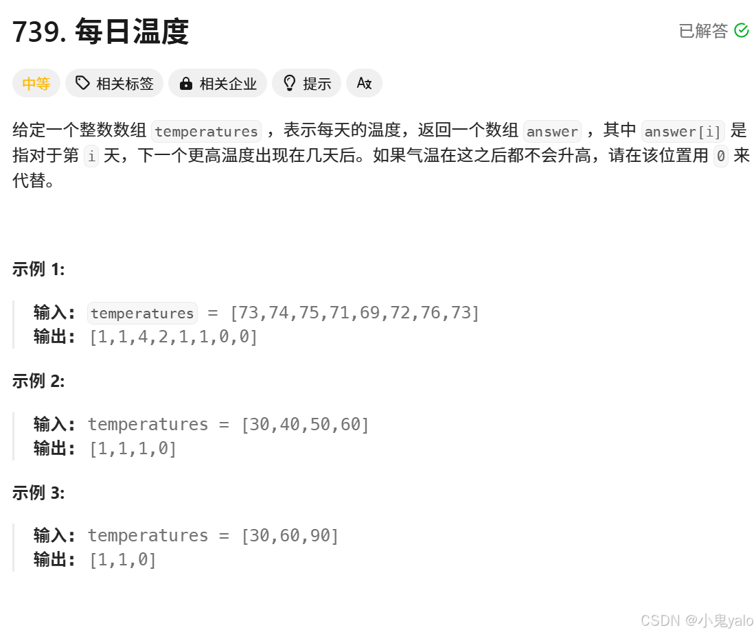对于给定的一个temperatures数组,每个元素表示当天的温度。对于每天的温度,求出下一次更高的温度出现在几天后。