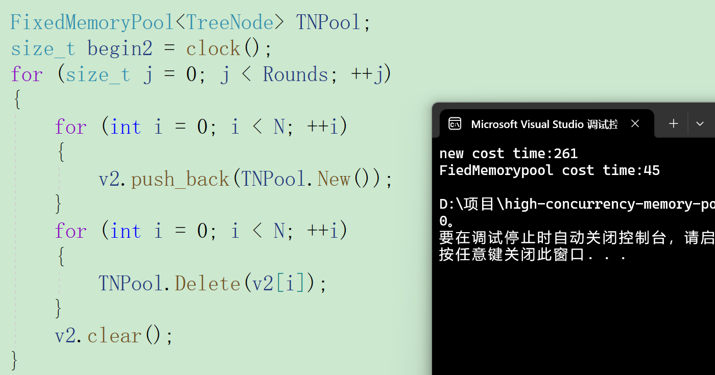 }这里以二叉树节点为例,比较标准库中的new和我们实现的内存池的性能