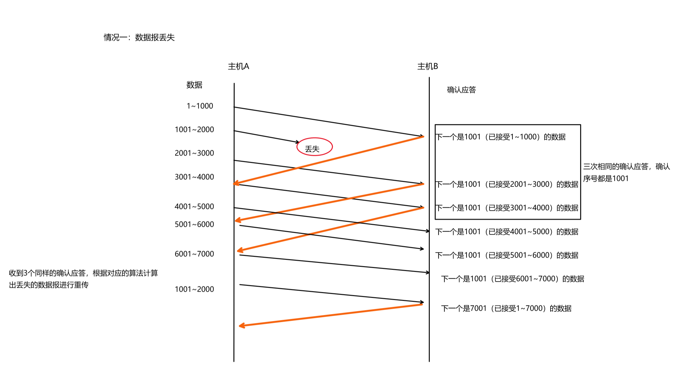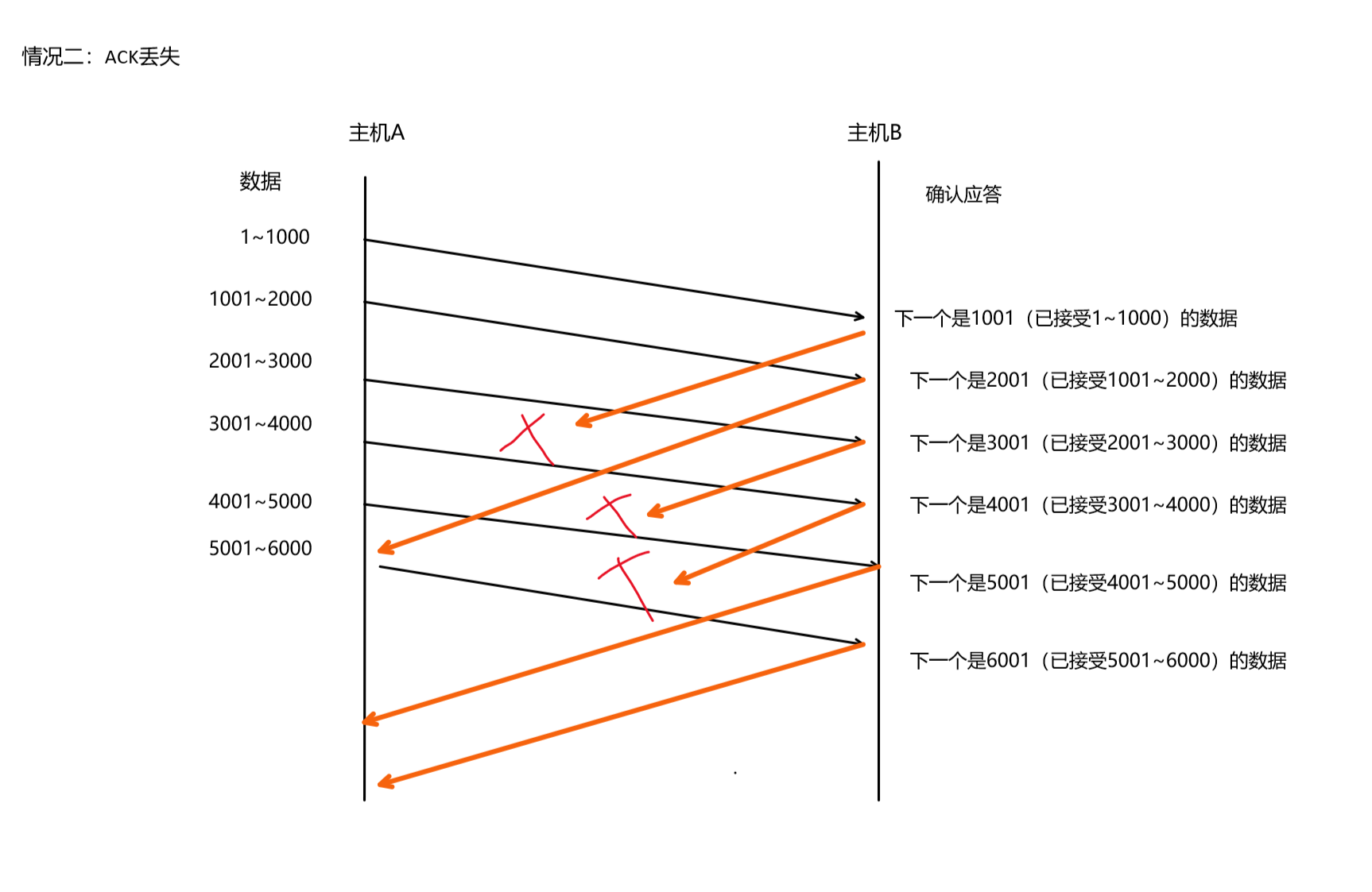 上述的情况只能确认1001~2000的报文丢失了,不能确定中间的是否丢失了。假设中间的4001~5000也丢失了,由于我们的通信一直再进行着,比如我们下面还会发送7001~8000,8001~9000的数据,那么此时的确认应答就是40001。也就是如果中间部分丢失了,会有后面的通信做兜底。同时,还有超时重传机制来确保。
