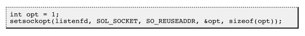 站在应用角度,一般都是既要实现TIME_WAIT,还要服务器可以立即重启。 使用 setsockopt()设置 socket 描述符的 选项 SO_REUSEADDR 为 1, 表示端口号复用。 int setsockopt(int sockfd, int level, int optname, const void *optval, socklen_t optlen);