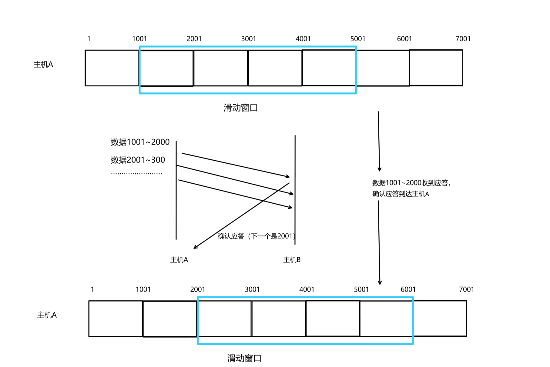 对于主机A,也就是发送端,会收到应答报文(或者捎带应答),比如收到确认序号为2001的应答报文,主机A就会认为序号为2001之前的所有报文,对端已经全部收到了。这种方式可以大大提高数据传输的效率。