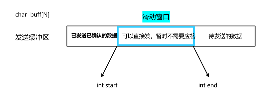 我们可以将发送缓冲区看成是一个char类型的数组,滑动窗口看成是发送缓冲区的一部分 。start指向滑动窗口的开始,end指向滑动窗口的结束。