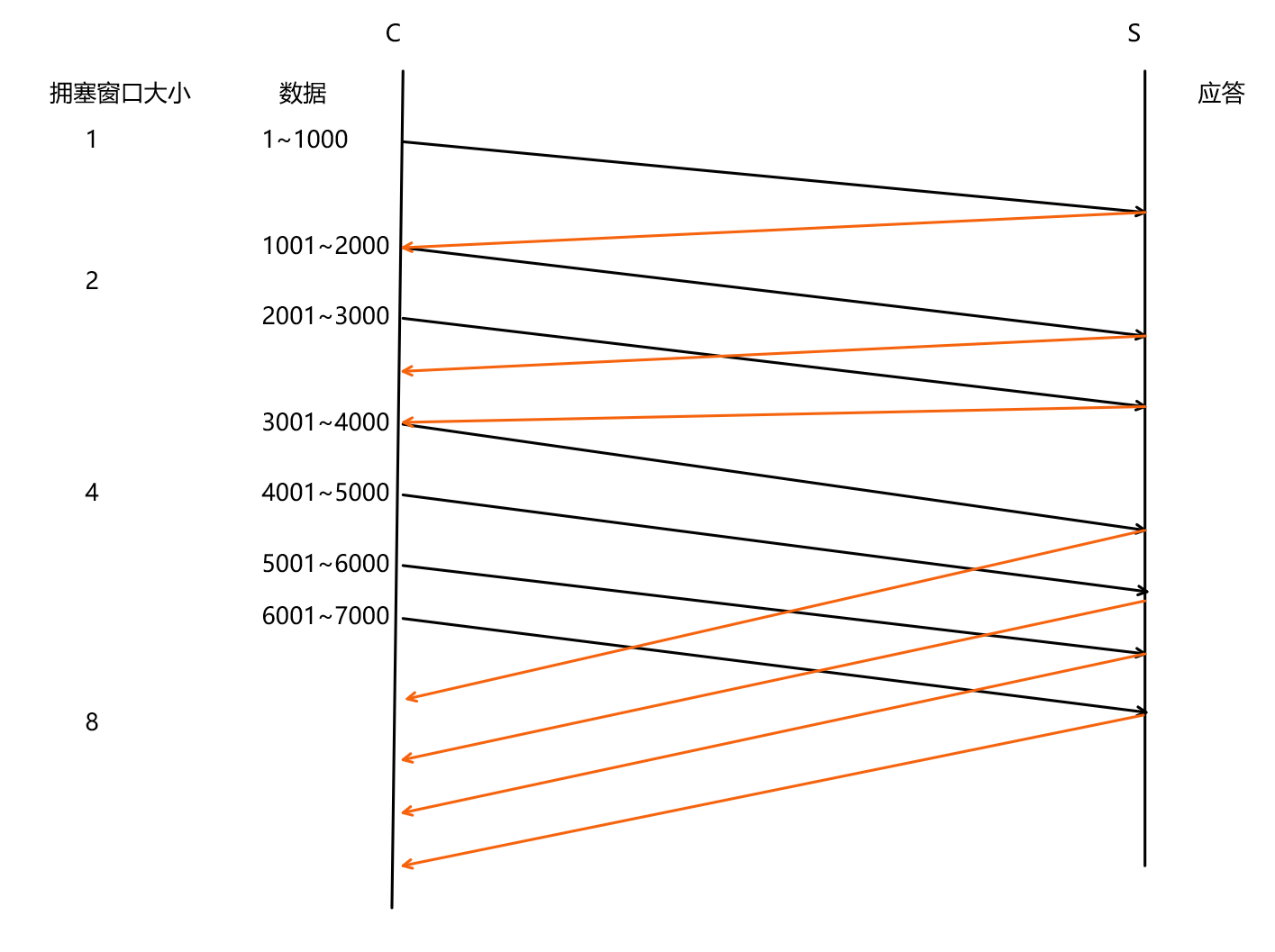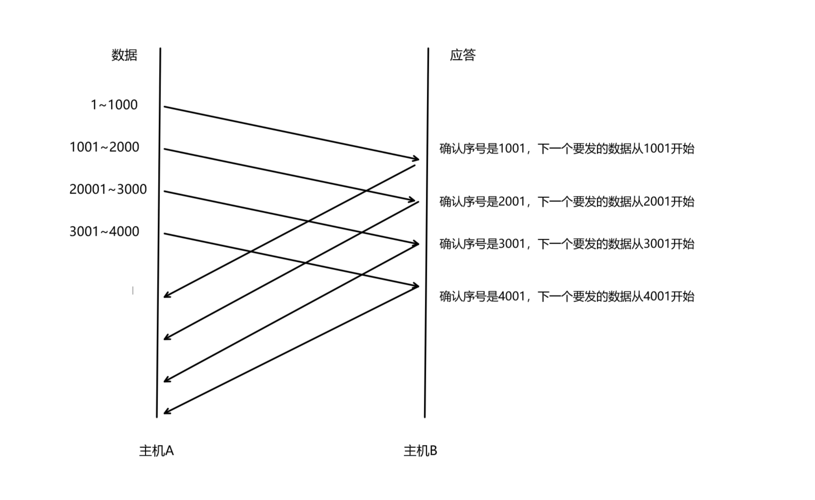 主机A向主机B发送数据,1~1000表示的是数据的大小,当发送的数据大小是1~1000时,序号就是1000,主机B收到后,进行应答,确认序号=序号+1,所以确认序号就是1001,同时下一个数据从1001开始发送,选后是依次增大的。发送前4个报文的时候,不需要等待ACK,可以直接发送。