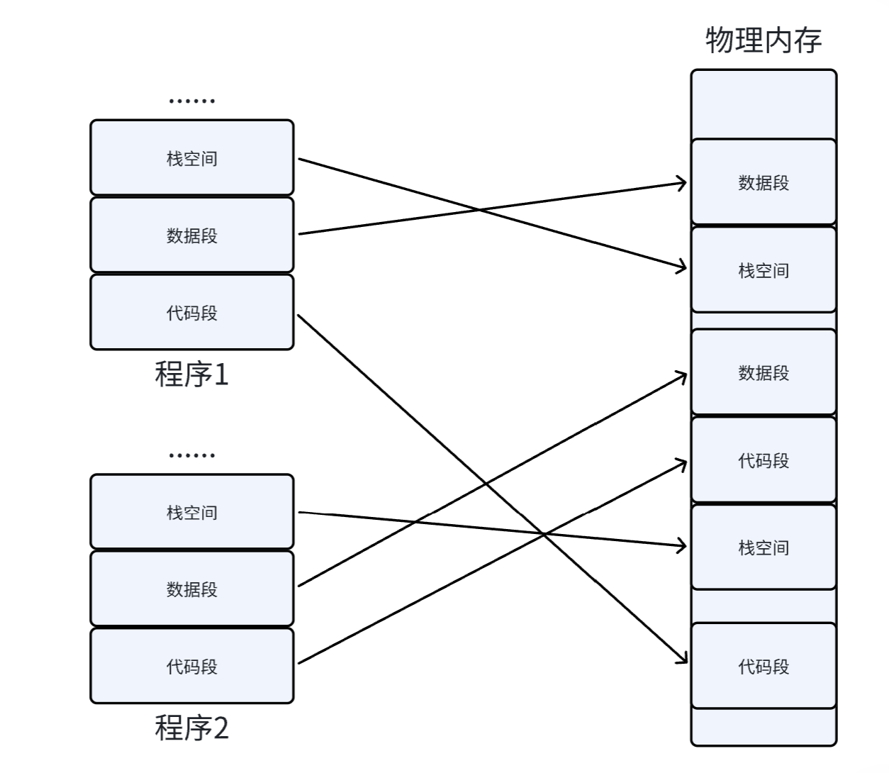 因为每一个程序的代码、数据长度都是不一样的,按照这样的映射方式,物理内存将会被分割成各种离散的、大小不同的块。经过一段运行时间之后,有些程序会退出,那么它们占据的物理内存空间可以被回收,导致这些物理内存都是以很多碎片的形式存在。