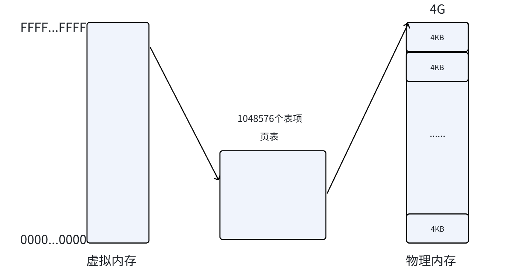 页表中的每⼀个表项,指向⼀个物理页的开始地址。在 32 位系统中,虚拟内存的最大空间是4GB ,这是每一个用户程序都拥有的虚拟内存空间。既然需要让 4GB 的虚拟内存全部可用,那么页表中就需要能够表示这所有的 4GB 空间,那么就一共需要 4GB/4KB = 1048576 个表项。如下图所示: