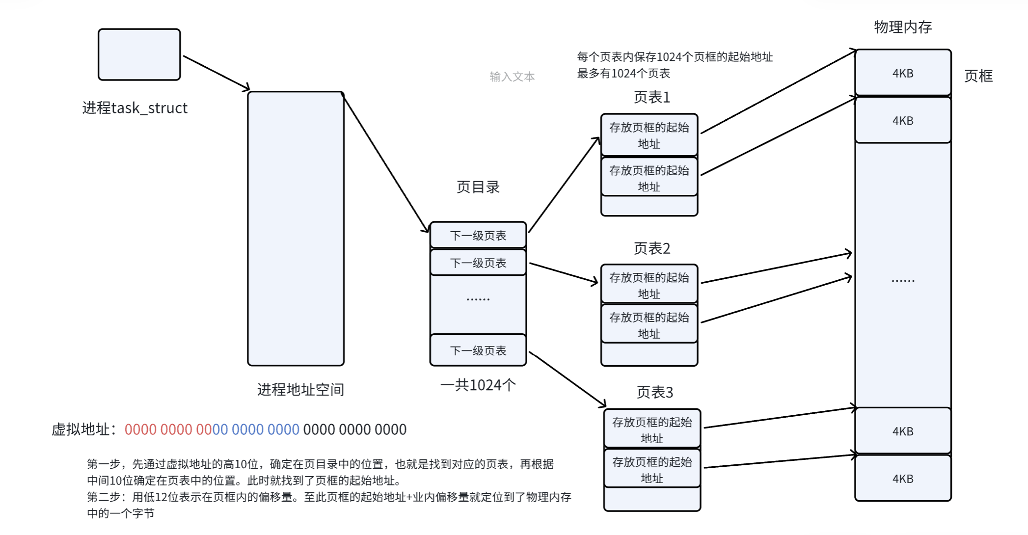 每一个页表项指向一个4KB 的物理页,那么一个页表中1024 个页表项,一共能覆盖 4MB 的物理内存;