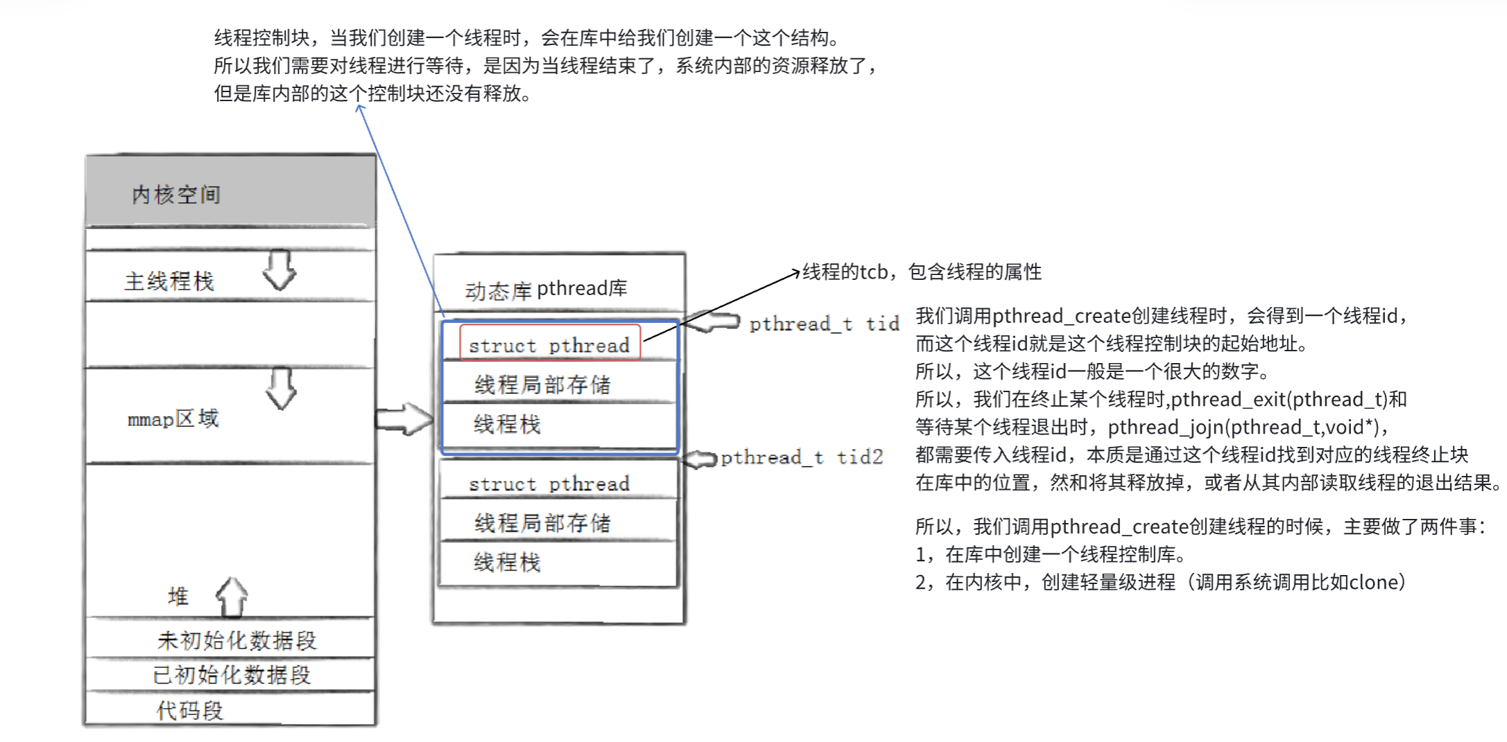 比如,在pthread库内部,可以定义一个诸如struct tcb的结构体,其成员可以包括线程状态,线程id,线程独立栈结构,线程栈大小等等。而这个结构中不应该包含线程的上下文数据,线程的时间片,线程的调度优先级等等数据,因为这些概念都是系统级别的,这些信息是在系统中保存的。