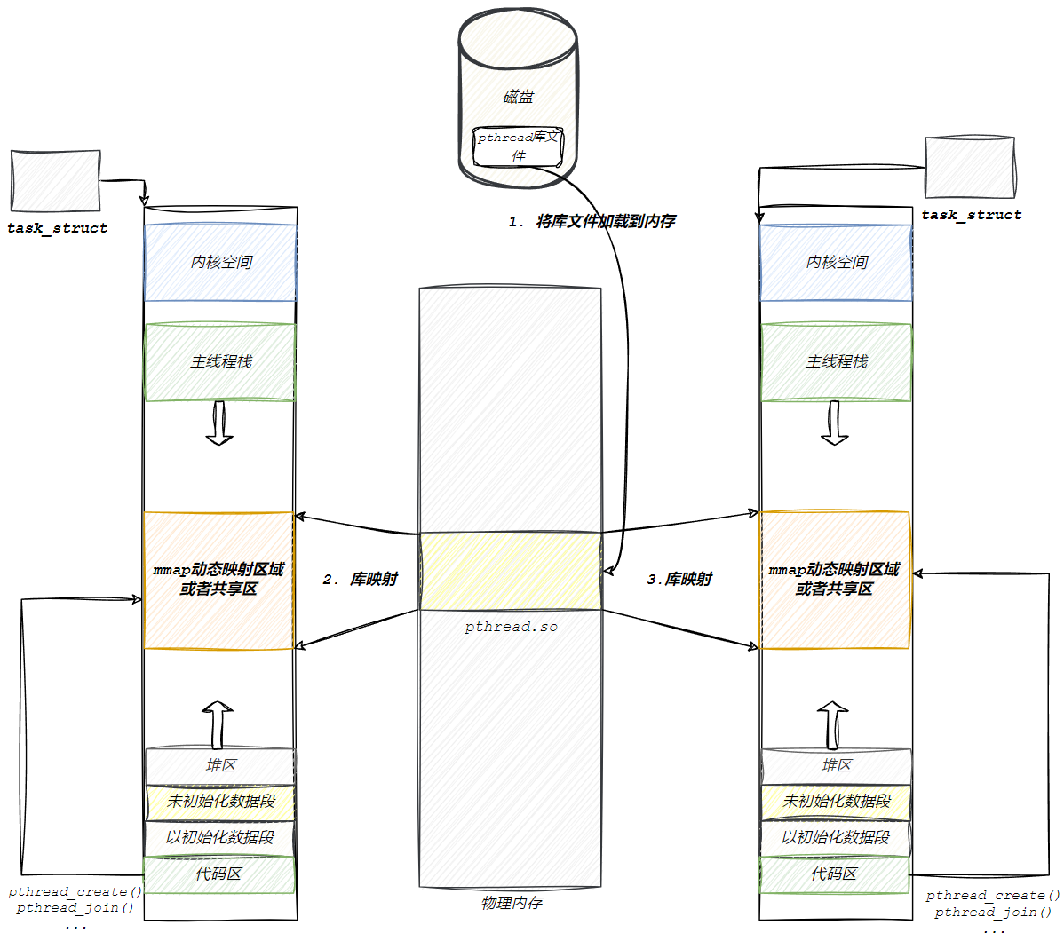 然而对于主线程生成的子线程而言,其 stack 将不再是向下生成的,而是事先固定下来的。线程栈一般是调用glibc/uclibc等的 pthread 库接口pthread_create 创建的线程,在文件映射区(或称之为共享区),其中使用mmap 系统调用。