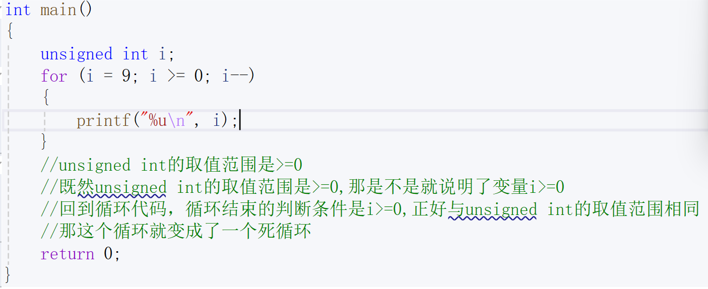 }unsigned int的取值范围是>=0,既然unsigned int的取值范围是>=0,那是不是就说明了变量i>=0 回到循环代码,循环结束的判断条件是i>=0,正好与unsigned int的取值范围相同,那这个循环就变成了一个死循环