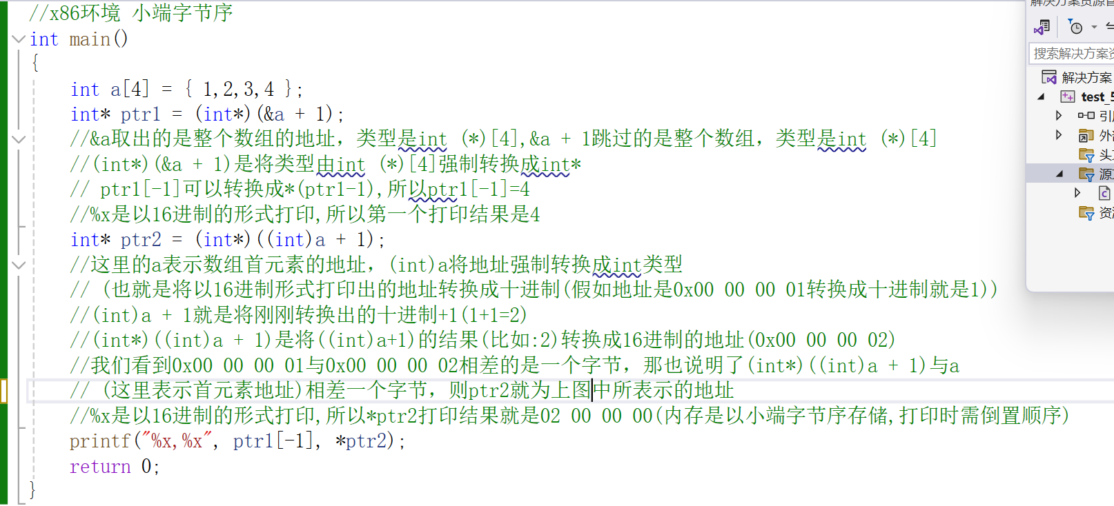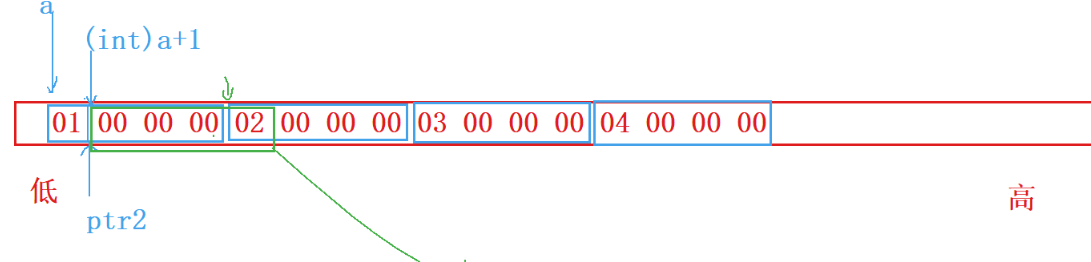 }int a[4] = { 1,2,3,4 }; int* ptr1 = (int*)(&a + 1); &a取出的是整个数组的地址,类型是int (*)[4],&a + 1跳过的是整个数组,类型是int (*)[4]。 (int*)(&a + 1)是将类型由int (*)[4]强制转换成int*, ptr1[-1]可以转换成*(ptr1-1),所以ptr1[-1]=4; %x是以16进制的形式打印,所以第一个打印结果是4。 int* ptr2 = (int*)((int)a + 1); 这里的a表示数组首元素的地址,(int)a将地址强制转换成int类型(也就是将以16进制形式打印出的地址转换成十进制(假如地址是0x00 00 00 01转换成十进制就是1)); (int)a + 1就是将刚刚转换出的十进制+1(1+1=2);(int*)((int)a + 1)是将((int)a+1)的结果(比如:2)转换成16进制的地址(0x00 00 00 02),我们看到0x00 00 00 01与0x00 00 00 02相差的是一个字节,那也说明了(int*)((int)a + 1)与a(这里表示首元素地址)相差一个字节,则ptr2就为下图中所表示的地址。 %x是以16进制的形式打印,所以*ptr2打印结果就是02 00 00 00(内存是以小端字节序存储,打印时需倒置顺序)