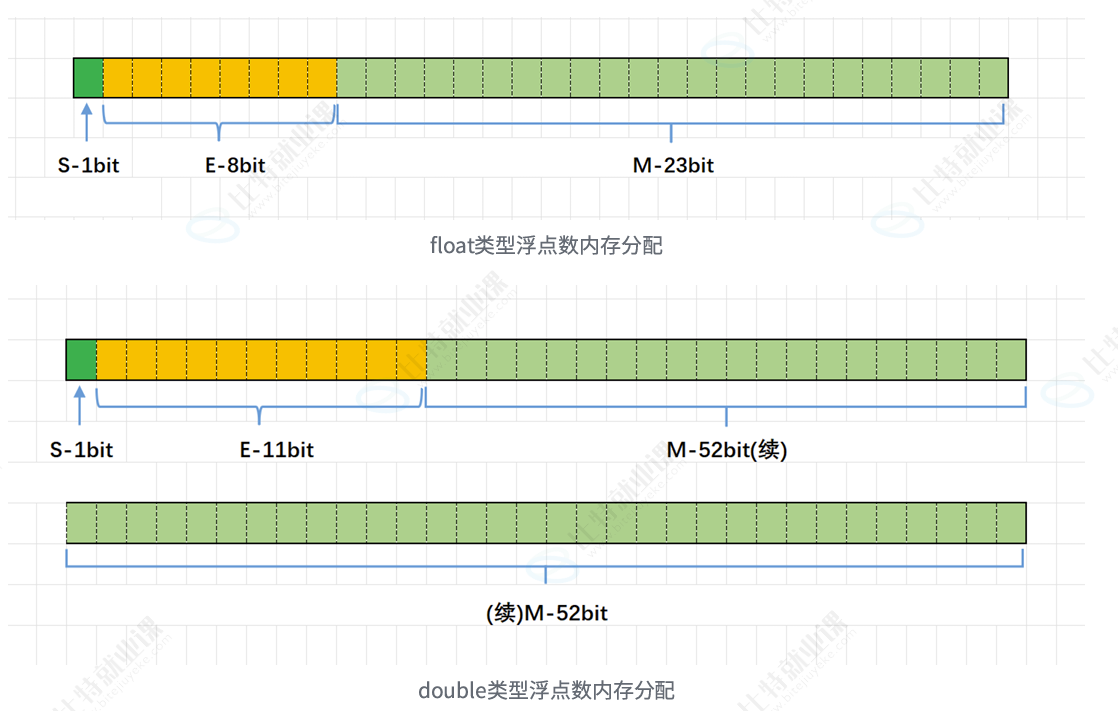 float E+127,然后再转换成二进制; double E+1023,然后再转换成二进制