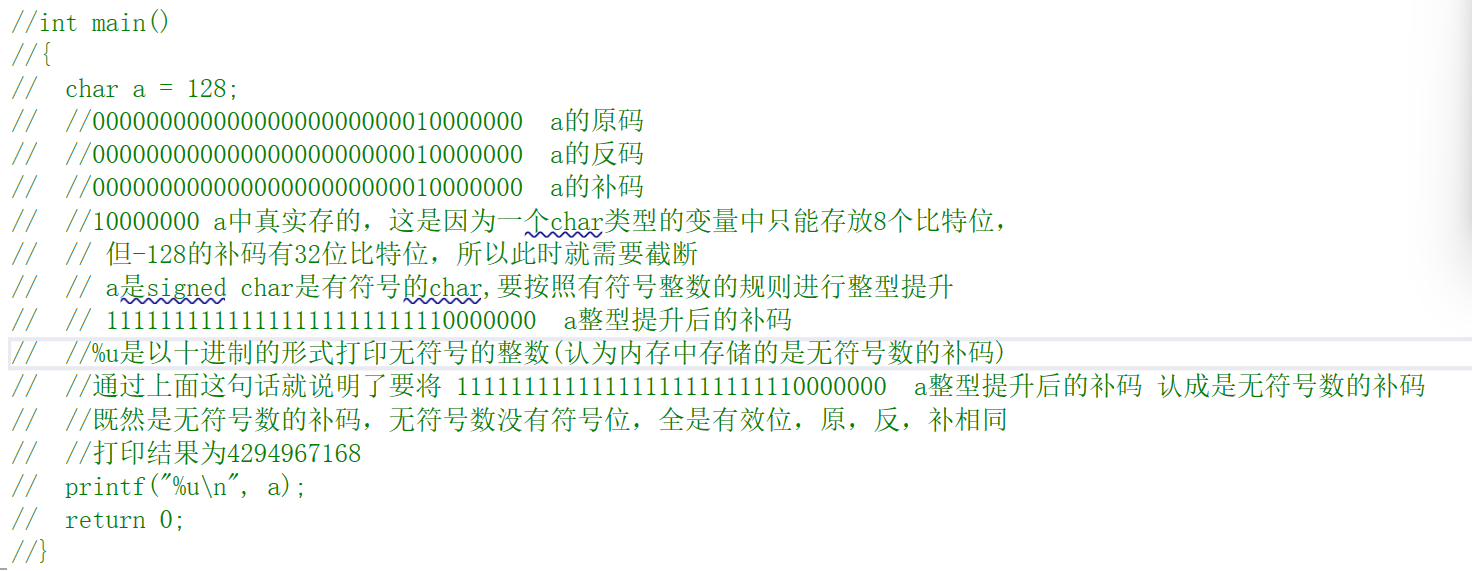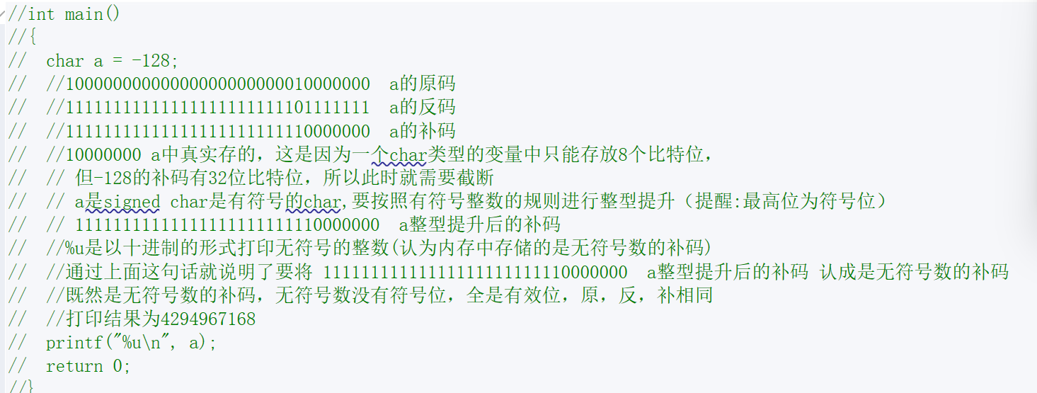 }char a = 128; 00000000000000000000000010000000 a的原码 00000000000000000000000010000000 a的反码 00000000000000000000000010000000 a的补码 10000000 a中真实存的,这是因为一个char类型的变量中只能存放8个比特位,但-128的补码有32位比特位,所以此时就需要截断 a是signed char是有符号的char,要按照有符号整数的规则进行整型提升 11111111111111111111111110000000 a整型提升后的补码 %u是以十进制的形式打印无符号的整数(认为内存中存储的是无符号数的补码),通过这句话就说明了要将 11111111111111111111111110000000 a整型提升后的补码 认成是无符号数的补码 既然是无符号数的补码,无符号数没有符号位,全是有效位,原,反,补相同 打印结果为4294967168