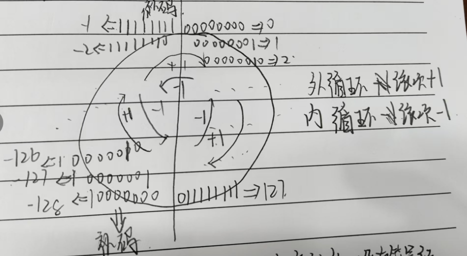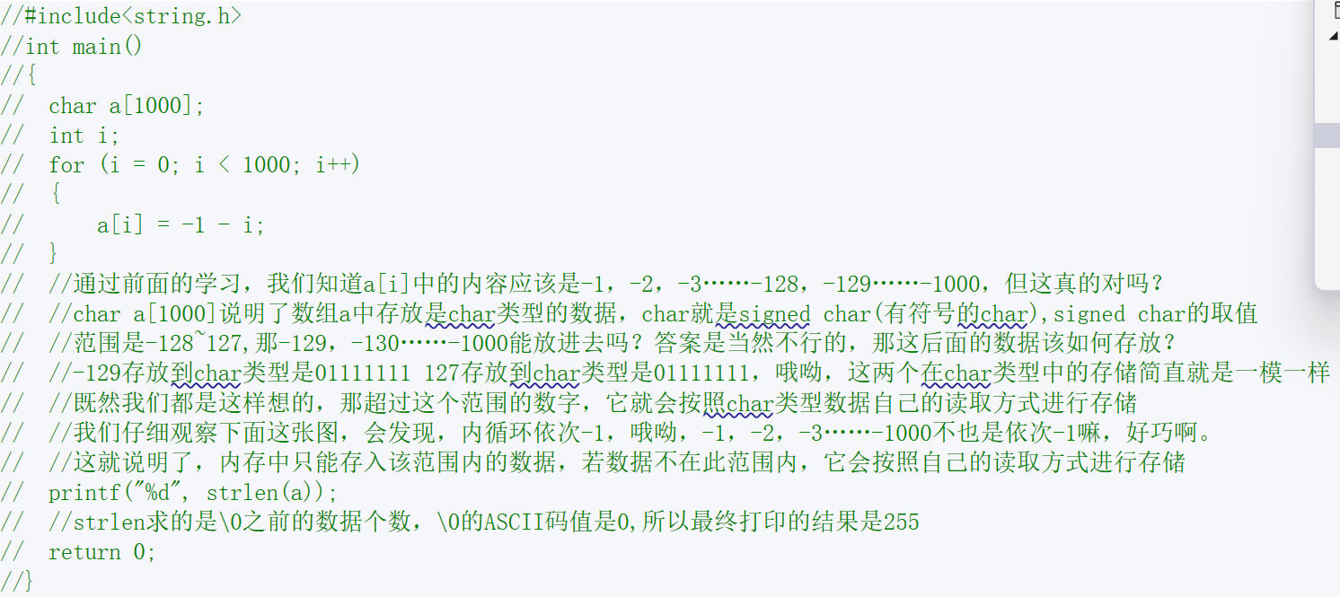 }char a[1000]; int i; for (i = 0; i < 1000; i++) { a[i] = -1 - i; } 通过前面的学习,我们知道a[i]中的内容应该是-1,-2,-3……-128,-129……-1000,但这真的对吗?char a[1000]说明了数组a中存放是char类型的数据,char就是signed char(有符号char),signed char的取值范围是-128~127,那-129,-130……-1000能放进去吗?答案是当然不行的,那这后面的数据该如何存放? -129存放到char类型是01111111 127存放到char类型是01111111,哦呦,这两个在char类型中的存储简直就是一模一样,既然我们都是这样想的,那超过这个范围的数字,它就会按照char类型数据自己的读取方式进行存储 我们仔细观察下面这张图,会发现,内循环依次-1,哦呦,-1,-2,-3……-1000不也是依次-1嘛,好巧啊