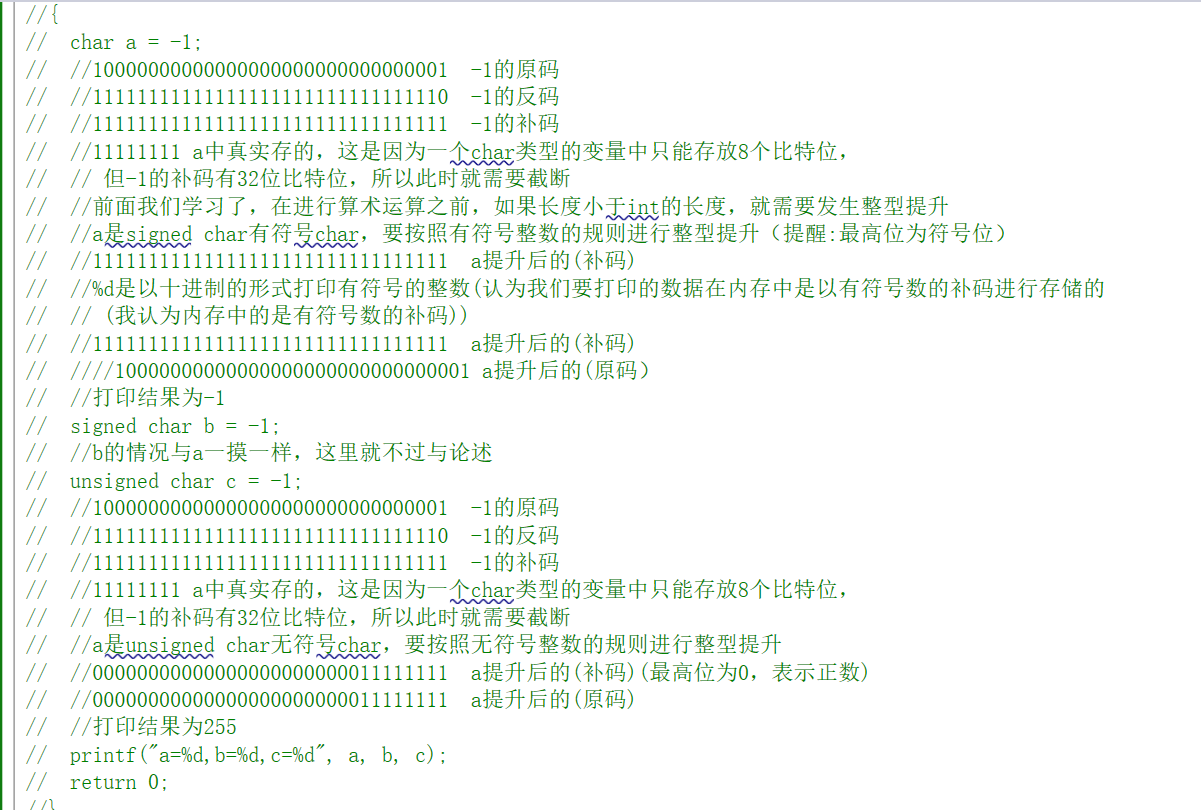 ok,接下来让我们来看这道题: char a = -1; 10000000000000000000000000000001 -1的原码 11111111111111111111111111111110 -1的反码 11111111111111111111111111111111 -1的补码 11111111 a中真实存的,这是因为一个char类型的变量中只能存放8个比特位,但-1的补码有32位比特位,所以此时就需要截断。 前面我们学习了,在进行算术运算之前,如果长度小于int的长度,就需要发生整型提升,整型提升要看这个数的类型。 a是signed char有符号char,要按照有符号整数的规则进行整型提升详解操作符-CSDN博客(提醒:最高位为符号位) 11111111111111111111111111111111 a提升后的(补码) %d是以十进制的形式打印有符号的整数(认为我们要打印的数据在内存中是以有符号数的补码进行存储的(我认为内存中的是有符号数的补码)) 11111111111111111111111111111111 a提升后的(补码) 10000000000000000000000000000001 a提升后的(原码) 打印结果为-1 signed char b = -1; b的情况与a一摸一样,这里就不过与论述 unsigned char c = -1; 10000000000000000000000000000001 -1的原码 11111111111111111111111111111110 -1的反码 11111111111111111111111111111111 -1的补码 11111111 c中真实存的,这是因为一个char类型的变量中只能存放8个比特位, 但-1的补码有32位比特位,所以此时就需要截断 c是unsigned char无符号char,要按照无符号整数的规则进行整型提升 00000000000000000000000011111111 c提升后的(补码)(最高位为0,表示正数) 00000000000000000000000011111111 c提升后的(原码) //打印结果为255